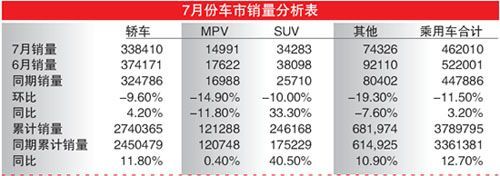 全国乘用车市场信息联席会最新统计数据显示,7月份我国乘用车市场出现连续第4个月的销量环比下降,且下滑幅度进一步加大,环比-11.5%。与此同时,业内专家及市场人士预测,8月份车市将持续负增长,且这个趋势很可能还将持续几个月。