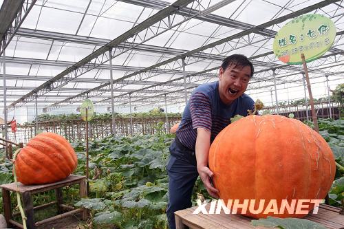 8月20日,在北京观光南瓜园,一位男士与巨型南瓜合影。新华社发(陈晓根摄)