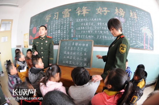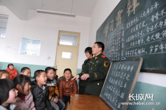 长城网唐山3月5日电( 张世豪 巢军)“学习雷锋好榜样,忠于革命忠于党……”3月2日,河北唐山市唐海县五农场小学二年级3班教师的歌声此起彼伏。武警战士与小朋友们沉浸在学歌、唱歌的快乐之中。