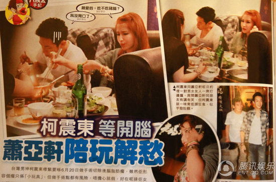腾讯娱乐讯(CFP/图文)某杂志拍到柯震东与萧亚轩去火锅店共进晚餐。据杂志爆料,萧亚轩与柯震东吃火锅时坐同排举止亲密,二人吃完后更是一前一后上车,萧亚轩全程微笑,心情大好。