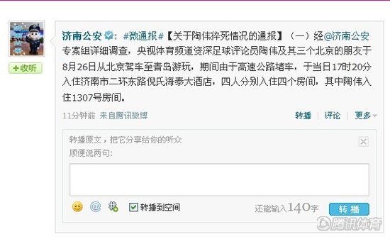 济南公安于28日10时40分许通过起官方微博向外界公布了对陶伟死亡的调查情况:经济南公安专案组详细调查,央视体育频道资深足球评论员陶伟及其三个北京的朋友于8月26日从北京驾车至青岛游玩,期间由于高速公路堵车,于当日17时20分入住济南市二环东路倪氏海泰大酒店,四人分别入住四个房间,其中陶伟入住1307号房间。