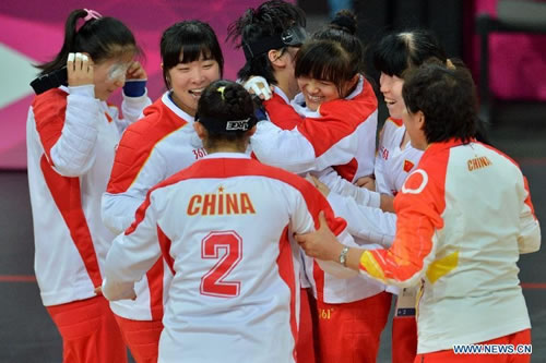 当日,在2012年伦敦残奥会女子盲人门球四分之一决赛中,中国队以5比0战胜美国队,晋级四强。新华社记者蔺以光摄