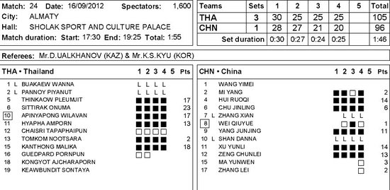 中国女排此役打不出快变战术,进攻机会远不如泰国多,扣球得分45比76大幅落后,防守救球次数9比26差距明显,俞家军拦网凭借身高优势18比9占优,发球得分3比5逊色一筹。女排此役中国队惠若琪和徐云丽都是取得全队最高的14分,曾春蕾取得13分,杨珺菁赢得11分,而泰国的奥努玛轰下23分荣膺得分王,玛丽卡砍下18分,普莱姆基特和维拉万都是取得17分。