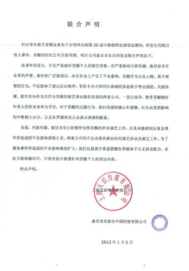 针对青年歌手苏醒在参加于台湾举办的第20届中歌榜群星演唱会期间,所发生的殴打他人事件,苏醒的经纪公司天娱传媒、唱片公司索尼音乐共同发表联合声明如下: