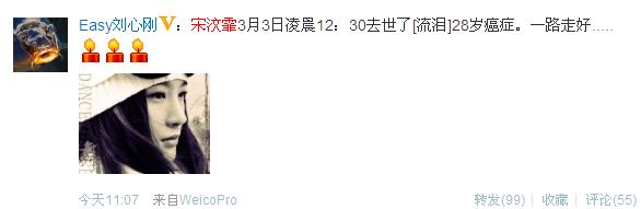 3月3日,导演刘心刚发微博表示,年仅28岁的演员宋汶霏患癌去世了。