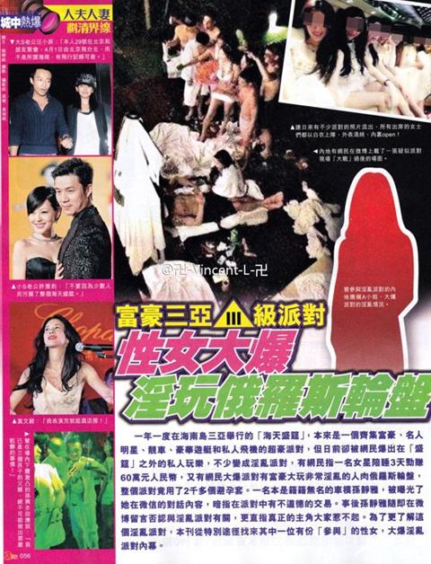 据香港媒体报道,一年一度在海南三亚举行的“海天盛筵”,本身一个齐集富豪、名人明星、豪车、豪华游艇和私人飞机的超豪华派对,但日前却被网友曝出盛筵之外的私人派对,不少变成了淫乱派对,更有网友指出一名女星三天赚60万人民币,又有网友大曝富豪大玩淫乱的人肉俄罗斯轮盘,竟用了2千多个避孕套。一名本身籍籍无名的车模孙静雅,被曝光了她在微信的对话,暗指她在派对中有不道德交易。事后孙静雅做出了否认,更称真正的主角大家惹不起。为了更了解派对的内幕,香港周刊寻找到其中一名有份参加的女主角,大爆淫乱派对内幕。