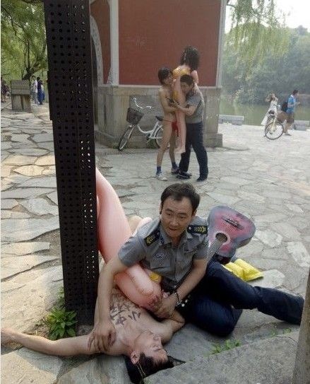 京华时报6月16日报道昨天下午4点半,两名年轻男子在北京大学校园内拿着吉他和充气娃娃裸奔,随后迅速被北京大学保卫部工作人员按倒在地带走。两名男子的同伴称此举意在号召人们保护知识产权,但现场多人对两人行为表示质疑,怀疑其是在炒作。