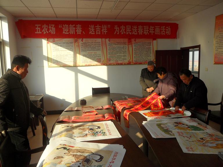 春节将至,五农场举办了以“迎新春、送吉祥”为主题的送春联及年画活动,为农工群众送上了新春的“文化大礼”。在活动现场,农工群众争先挑选着自己心仪的春联与年画。一幅幅写有“仁义忠孝传家久、诚敬勤俭年年丰”、“世代儒家无非积善、鸿运当头须是人勤”的春联,以及象征福、禄、寿的年画,既表达了农工群众对未来美好生活的向往,也是对提升自我休养的一种鞭策。此次活动,进一步传播了先进文化的正能量,在全场范围内营造了热烈、喜庆、祥和的节日文化氛围。