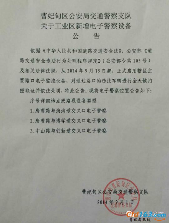2014年9月15日起,曹妃甸工业区主要路口将正式启用电子监控设备,对通过路口的违法车辆将进行全天候拍照取证,并依法处罚,特此公告。
