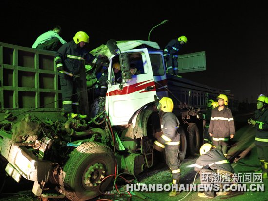 9月25日凌晨3时许,“咣当”一声响,一辆载有上百吨钢铁的大挂车在曹妃甸工业区纳潮河1号桥北200米减速带处,追尾前面的挂车,驾驶室右侧被撞散,驾驶室下车轮插入前车下面,整个车头报废。事故发生后,追尾车驾驶员被挤在左边驾驶室内不能动弹,前车的驾驶员马上拨通了“120”“119”。大约10分钟后,曹妃甸工业区公安消防大队迅疾赶到现场,立即对驾驶室内的驾驶员展开救援。随后,曹妃甸公安交警、医院“120”救护车陆续赶来。经过救援民警半个多小时的拆解,追尾挂车的驾驶员被抬出驾驶室,所幸伤势不重。据交警介绍,超载、疲劳驾驶、未注意前车减速是造成这次事故的主要原因。
