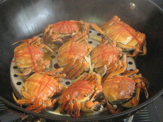 3.锅里加适量清水,加些料酒,把螃蟹放到蒸屉上,撒上一些姜丝。