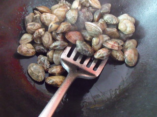 2.锅里放油一汤匙,烧热,下花蛤大火煸炒到微微开口,倒入葡萄酒,翻炒