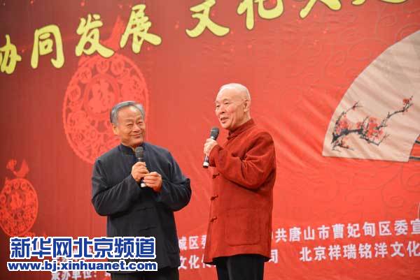 17日,相声表演艺术家李金斗、李建华在河北唐山曹妃甸区表演相声《红灯记》。新华网北京频道发 李骁姗 摄