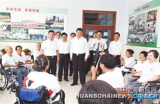 之后,习近平前往唐山市截瘫疗养院。他在康复室看望正在做康复训练的截瘫伤员,一一了解他们的伤情和康复治疗情况,问他们还有什么困难,祝他们健康长寿。在疗养病室,他同因地震伤害截瘫的杨玉芳、高志宏夫妇亲切交谈。得知他们长期参加力所能及的劳动和工作,努力融入社会、自食其力,习近平很高兴。夫妇俩向总书记赠送自己新近出版的小说和诗歌集,并即兴朗诵了一首歌颂解放军当年抗震救灾英勇事迹的诗歌,习近平称赞他们乐观上进、事迹感人,用行动诠释了生命的价值和意义。活动室内,10多位截瘫伤员正在开展文娱活动,习近平来到他们中间,同他们亲切交谈,并欣赏了二胡伴唱《唱支山歌给党听》。习近平勉励他们说,健全人可以活出精彩的人生,残疾人也可以活出精彩的人生。我们每个人都要珍惜生命、追求健康,努力创造无愧于时代的精彩人生。习近平指出,大爱无疆,医者仁心,医护人员要树立把伤残人当亲人的思想,为伤残人提供周到细致的服务。