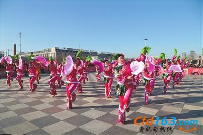 图为2月10日,在创业广场举办的秧歌汇演活动现场,巾帼海之韵广场舞协会正在表演。